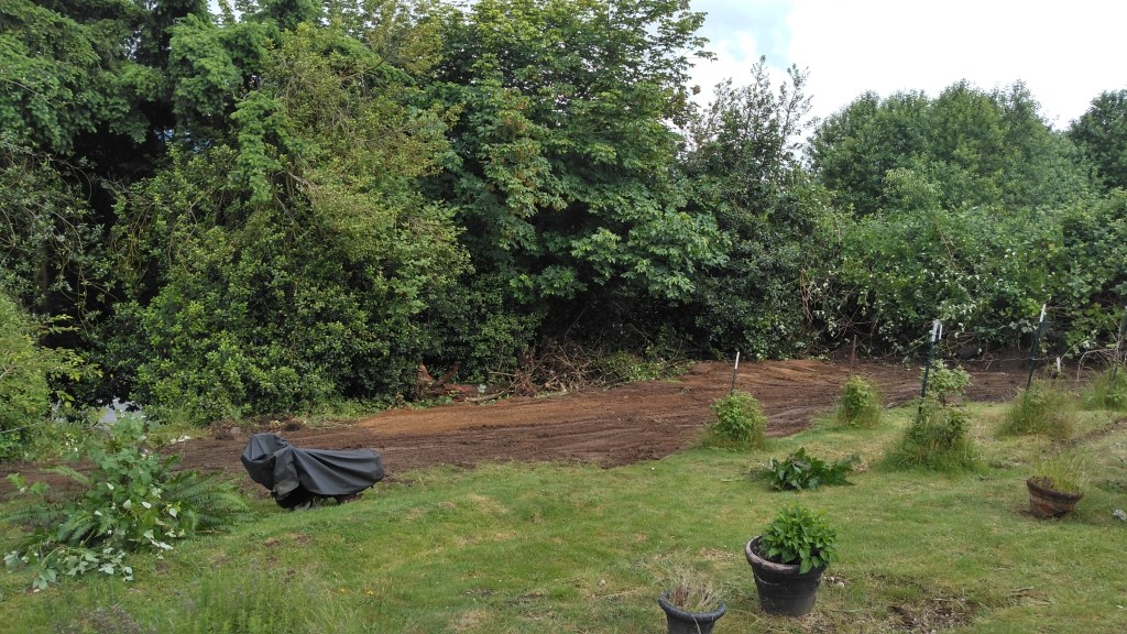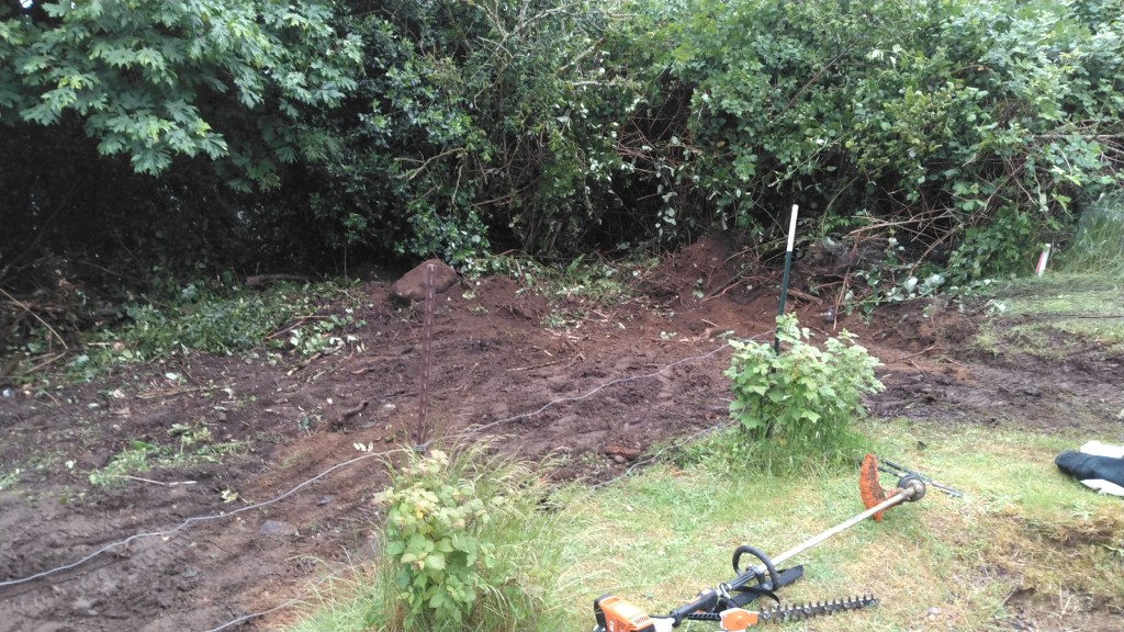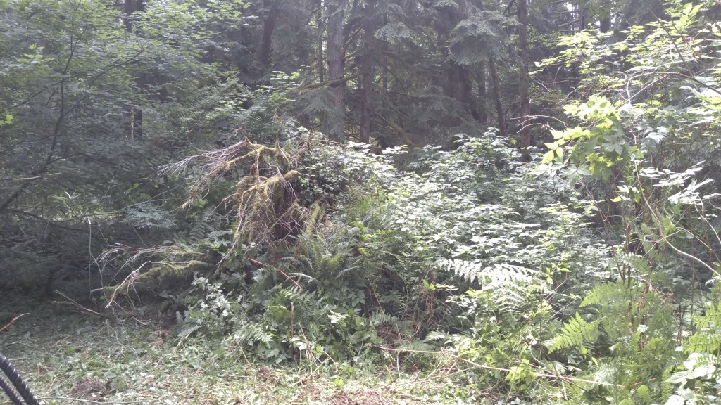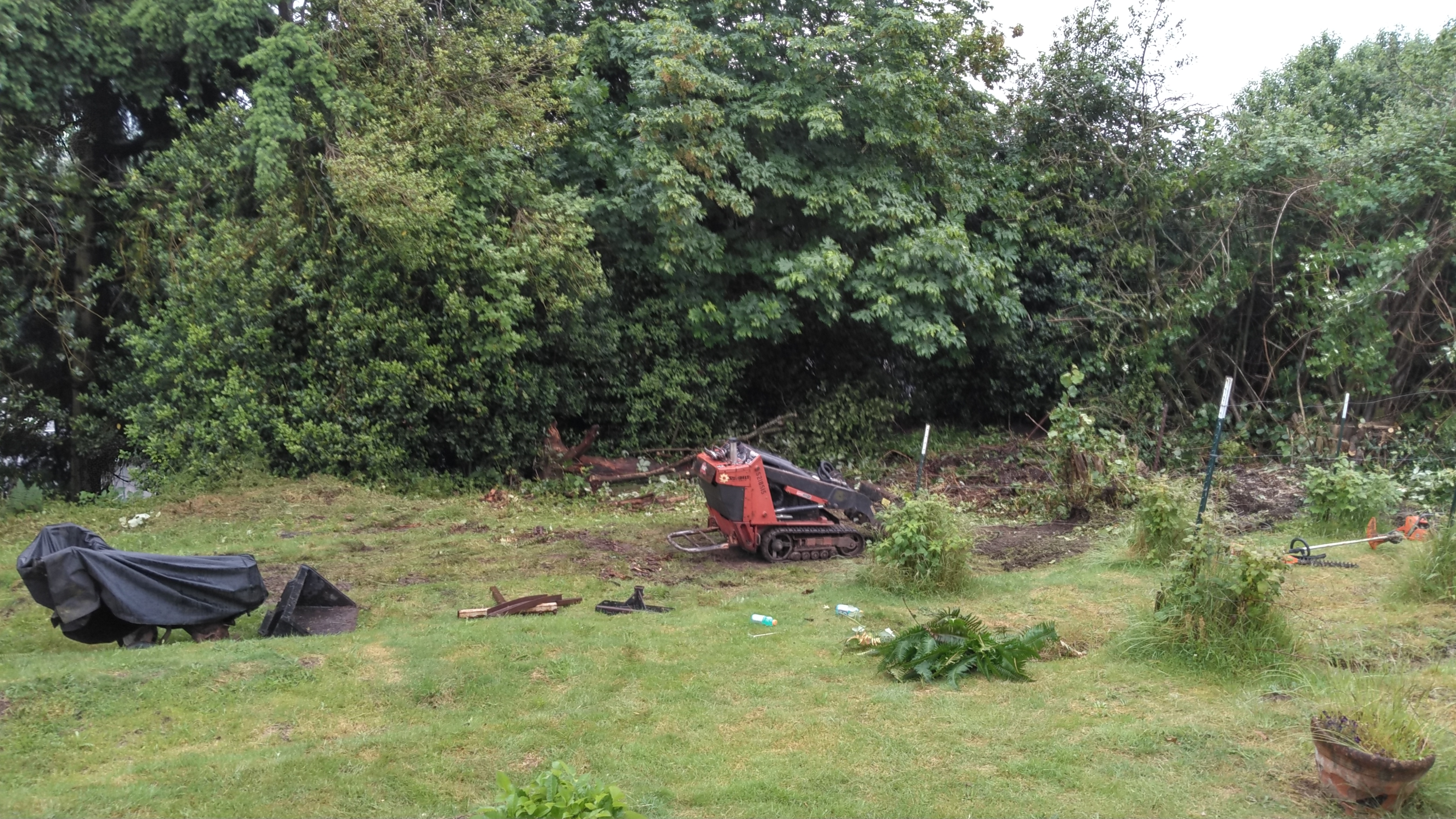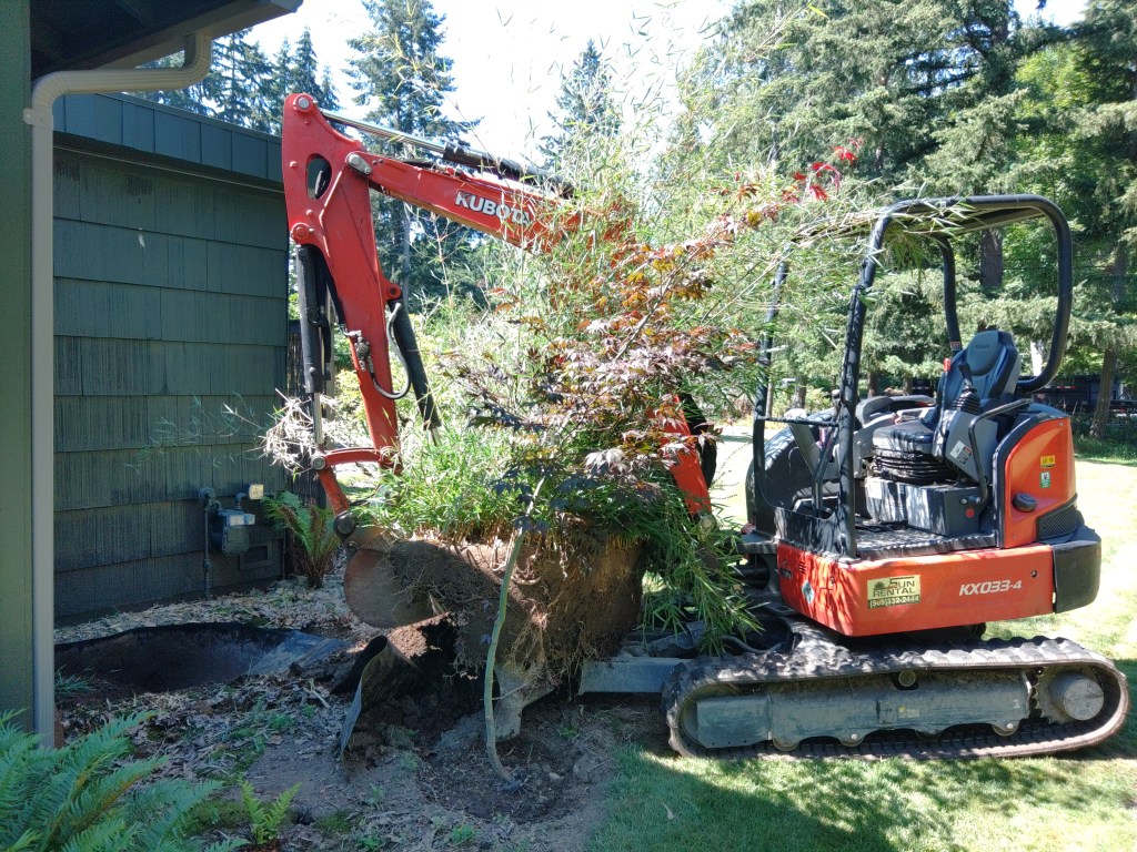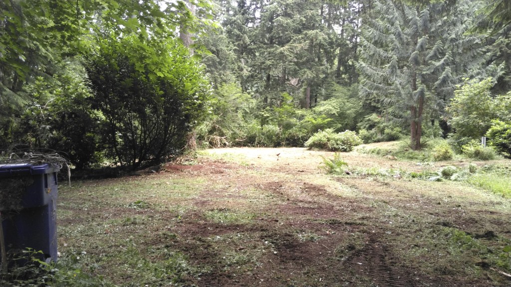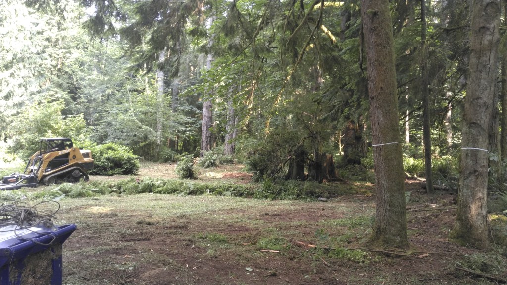 clearing, grading and pulling a couple small stumps along back of property to prepare for new garden bed and fence on hillside with 42″ access