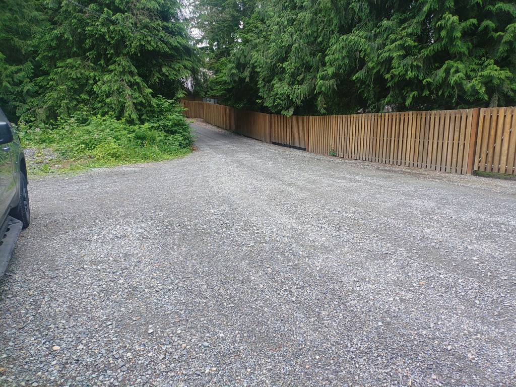 removing topsoil spreading 3″ minus recycled/crushed concrete base and finishing with recycled asphalt