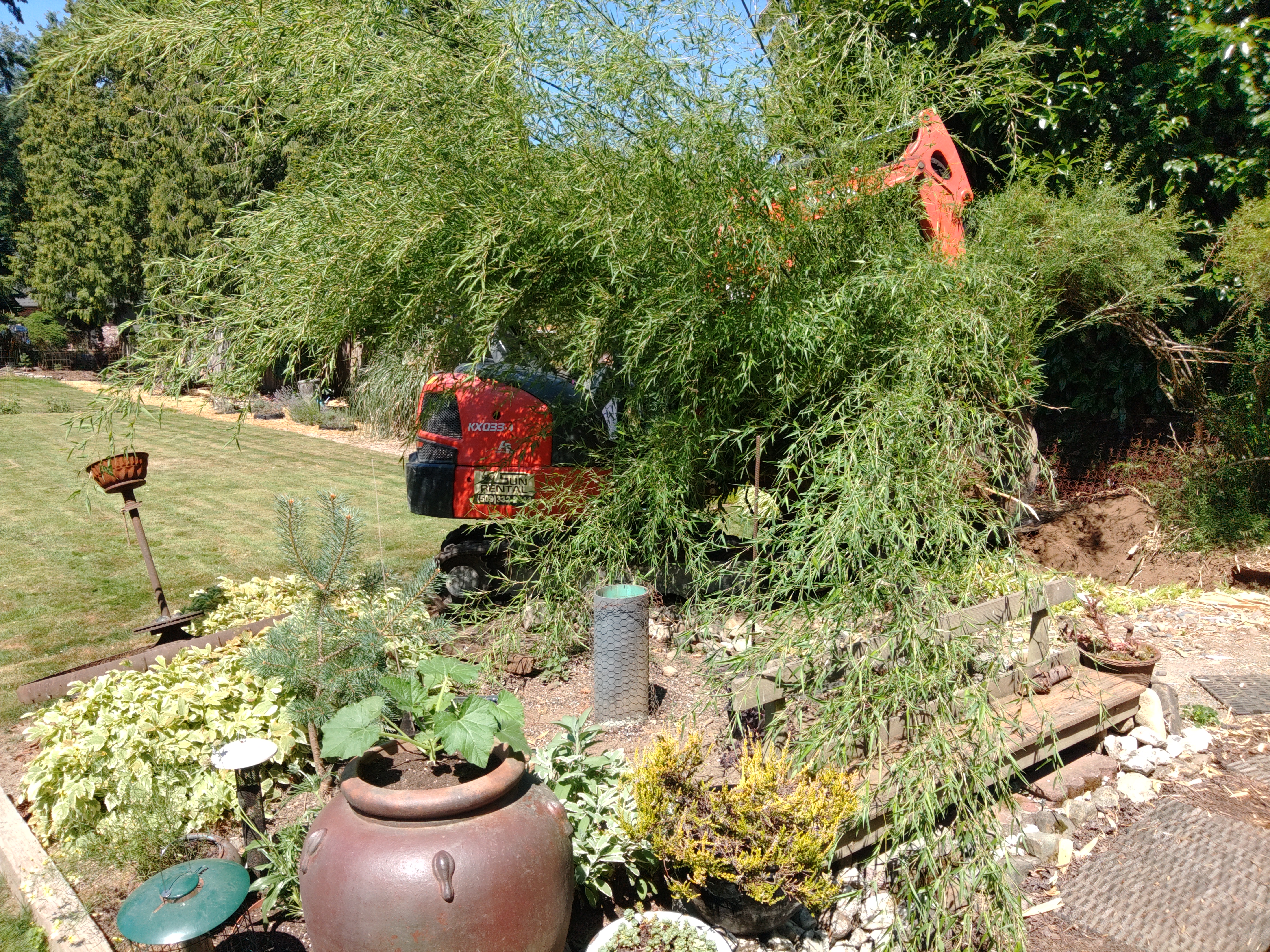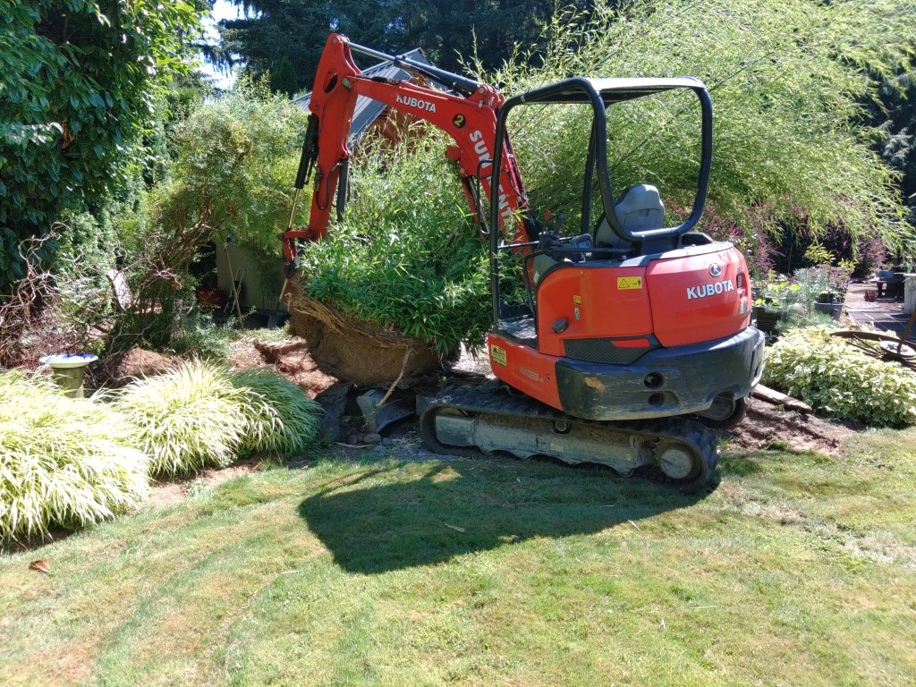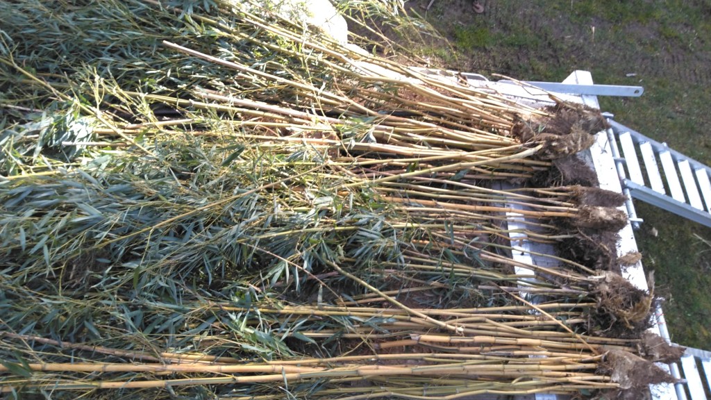 Bamboo can quickly take over spreading up to 40′ in a season. These clumps had an 18″ deep barrier installed yet roots were starting to grow under and take over the surrounding garden. we had to dig down below 24″ removing as much of the roots as possible. to reduce the chance of it growing back.